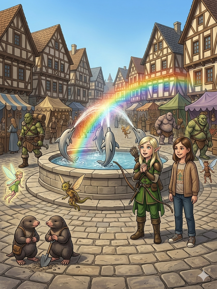 "Wow", hörte Levina auf einmal hinter sich. Sie drehte sich um und sah ihre Schwester. Über ihrem Kopf schwebte in weißer Schrift der Name "Josefina" und daneben stand eine eins. Levina schaute ihrer Schwester direkt in die Augen. Sie sah genau so aus wie immer. Ophelia starrte Levina an und fragte dann "Levina? Bist du das? Wieso konntest du eine Elfe auswählen? Das gab es bei mir überhaupt nicht zur Auswahl. Das ist ungerecht. Du siehst aber echt cool aus". "Danke. Ich weiß auch nicht warum. Auf einmal konnte ich die Elfe auswählen und sie hat mir sehr gut gefallen", antwortete Levina. "Ja das passt super zu dir, die Goldenden Haare und die spitzen Ohren und wow, deine Augen leuchten ja noch blauer als sonst. Ich hatte überlegt, ob ich nen Troll nehmen soll, aber ich konnte mich nicht entscheiden. Deswegen hab ich dann einfach mich selbst genommen. Aber nun zum wichtigsten: Wo sind wir hier?", wollte Ophelia wissen. "Ich weiß es nicht", antwortete Levina, "Aber es sieht wunderschön aus. Der Brunnen mit den Delphinen gefällt mir besonders gut." Die beiden Mädchen liefen über den Platz und betrachteten alles. Auf einmal erschien vor ihnen in der Luft der Text "Hauptplatz entdeckt: 50 XP". "Siehst du das auch?" wollte Ophelia von ihrer Schwester wissen. "Ja, was bedeutet das?", antwortete Levina. "Ich weiß es nicht, aber es sieht ein wenig so aus wie bei den Computerspielen von Papa, oder bei Pokémon, da bekommt mach auch XP. Ich glaub, das bedeutet Erfahrungspunkte oder so. Wenn man einige davon gesammelt hat, werden die Pokémon stärker." "Cool, können wir dann auch stärker werden?", fragte Levina und kratzte sich am Kopf. "Lass es uns herausfinden", ermunterte Ophelia ihr kleine Schwester und die beiden stapften los, um noch mehr von der Welt zu erforschen.