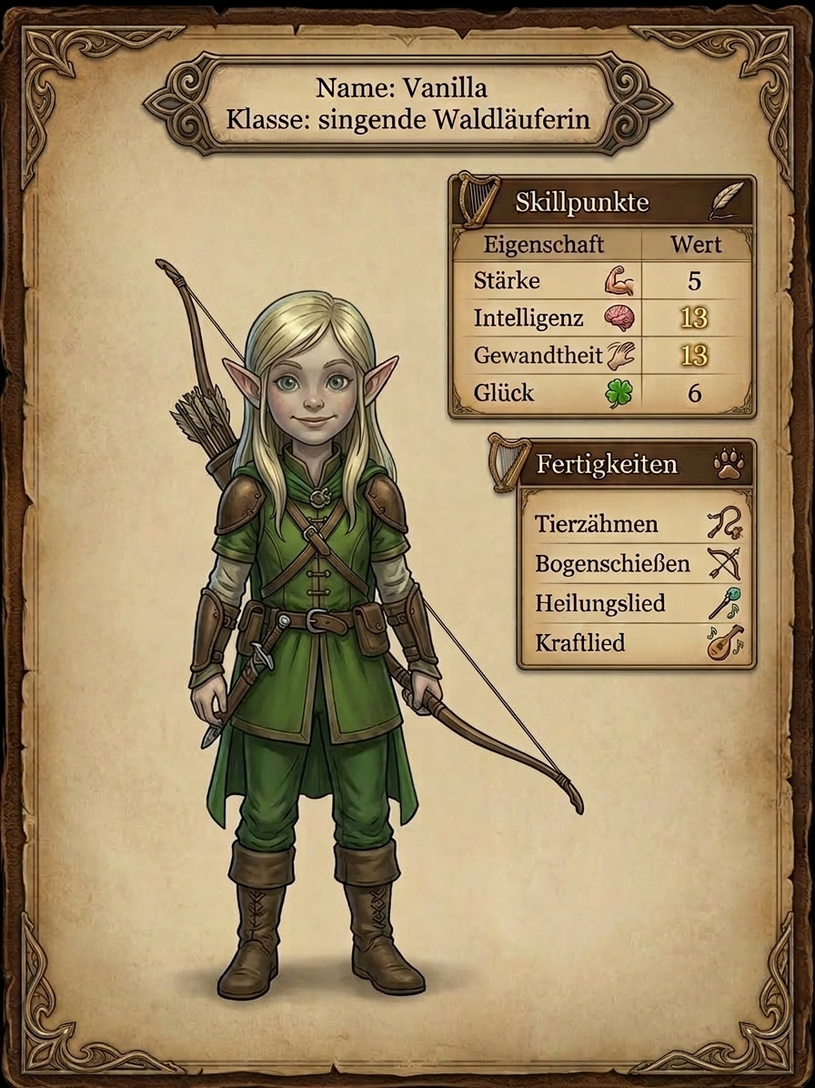 Sie dachte ganz angestrengt nach "Menü öffnen" und stellte sich vor, wie vor ihren Augen ein Auswahlmenü aufging. Sie erschrak, als sie ein "pling"-Geräusch hörte und sich vor ihr in der Luft ein Fenster öffnete, in dem sie lesen konnte: Charakterbogen, Inventar, Einstellungen, Land verlassen. "Ah jetzt verstehe ich was ihr meint. Und wenn ich jetzt das mache" sie dachte an Charakterbogen öffnen und vor ihr öffnete sich ein neues Fenster, in dem sie sich selbst als Elfin sah mit ihrer grünen Hose und ihrem grünen Oberteil. Daneben stand Stärke 1, Intelligenz 1, Gewandtheit 1 und Glück 1. Neben jedem wert war ein Plusknopf zu sehen. Direkt darunter stand: verfügbare Skillpunkte 21. "Interessant", dachte Levina. Sie wollte gerade daran denken, auf den Intelligenz Knopf zu drücken, als ein neues Fenster vor ihr aufging: "Level 5 erreicht, bitte Klasse wählen" Im Fenster waren zwei Knöpfe: Annehmen, Abbrechen. "Annehmen", dachte Levina. Ein neues Fenster öffnete sich: Folgende Klassen stehen zur Auswahl. Singende Waldläuferin, tanzende Kräuterkundige und schleichende Kriegerin. "Hm, was sind das für komische Klasse", überlegte Levina. "Eine Kriegerin und schleichen, das passt irgendwie nicht so richtig zusammen. Tanzen mach ich eigentlich sehr gerne, aber Kräuterkundige, da klingt irgendwie langweilig. Singende Waldläuferin? Ich singe doch sehr gerne und Waldläuferin, das klingt so nach Pfeil und Bogen und heimlich im Wald laufen. Ich glaube, das soll es werden." Sie dachte im Kopf an 'singende Waldläuferin'. Ein Textfenster erschien vor ihr in der Luft: Hauptpunkte einer Waldläuferin Gewandtheit und Intelligenz. Doppelte Skillpunkte bei Verbesserung. "Wow, das klingt cool. Das muss ich gleich mal ausprobieren. Moment." Levina öffnete erneute den Charakterbogen und drückte in Gedanken auf das Plus neben Intelligenz. Nun hatte sie Intelligenz 3. "Ja, genau so hatte ich mir das vorgestellt. Nun mal bei Gewandtheit versuchen." Auch dort erhöhte sich der Wert von Levina nun auf 3. Als sie das Gleiche bei Stärke und Glück gemacht hatte, wurden die Werte nur um eins gesteigert. Nun hatte sie von ihren 21 Skillpunkten schon 4 verbraucht. Levina überlegte kurz und setzte dann einen Hauptteil ihrer Punkte in Intelligenz und Gewandtheit. Da sie immer auch etwas Glück haben wollte, setzte sie dort auch einige Punkte rein und zu guter Letzt noch etwas in Stärke. Somit sah ihr Charakterbogen nun wie folgt aus.