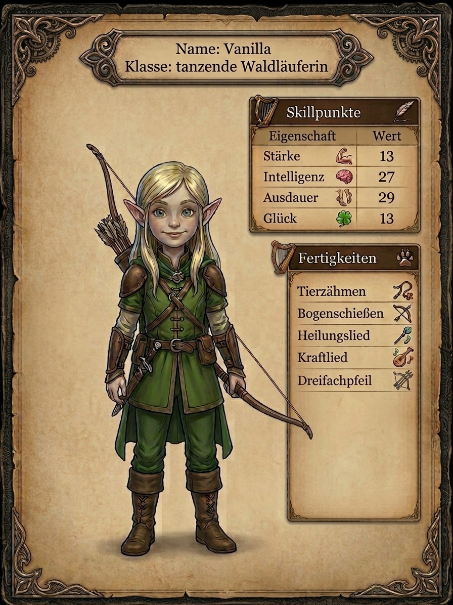 Levina nahm sich nochmal die Zeit und verteilte ihre Skillpunkte. Sie erhöhte ihre Stärke um 8 und alle anderen Werte um 7, was ihr bei Gewandtheit und Intelligenz einen Bonus von 14 Punkten gab. Außerdem fiel ihr auf, dass sie eine neue Fertigkeit hatte.