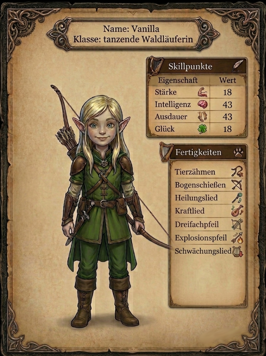 Levina betrachtete kurz ihren Status. "Wow, wir sind ja nochmal richtig im Level aufgestiegen. Ich bin jetzt Level 75", verkündete sie stolz. "Krass, das war mir in der ganzen Action mit Katzi gar nicht aufgefallen", freute sich auch Ophelia. Alle nahmen sich die Zeit, um ihre Skillpunkte zu verteilen. Ihr Charakterbogen sah nun wie folgt aus: